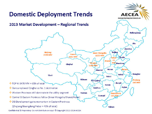 Given the central government’s intention to strongly promote distributed solar PV compared to utility-scale power plants, last years top 3 provinces were Zhejiang (165 MW), Guangdong (115 MW) and Hebei (74 MW), which accounted for approx. 43% of the total installed distributed power. In this context, AECEA is looking forward to how e.g. Gansu province which achieved a record installation of 3.8 GW last year, will according to its 2014 quota for large-scale system slow down to a mere 500 MW and whether some policy adjustments will follow in the next couple of months. To date, early signs are already visible that provincial quotas for large-scale projects are about to be exceeded.