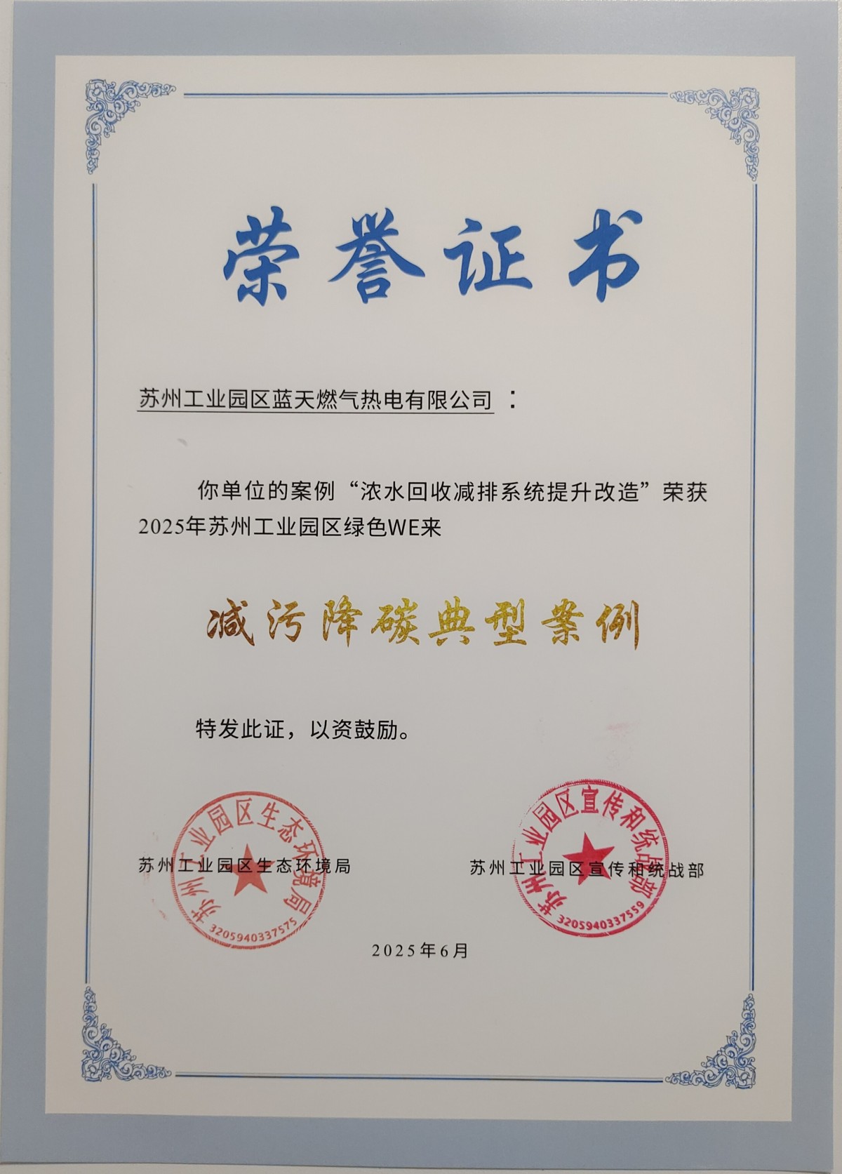 6月4日,蘇州工業園區藍天燃氣熱電有限公司“濃水回收減排系統改造案例”榮獲蘇州工業園區生態環境局“減污降碳典型案例”獎項,為企業綠色發展提供了可復制的樣板。