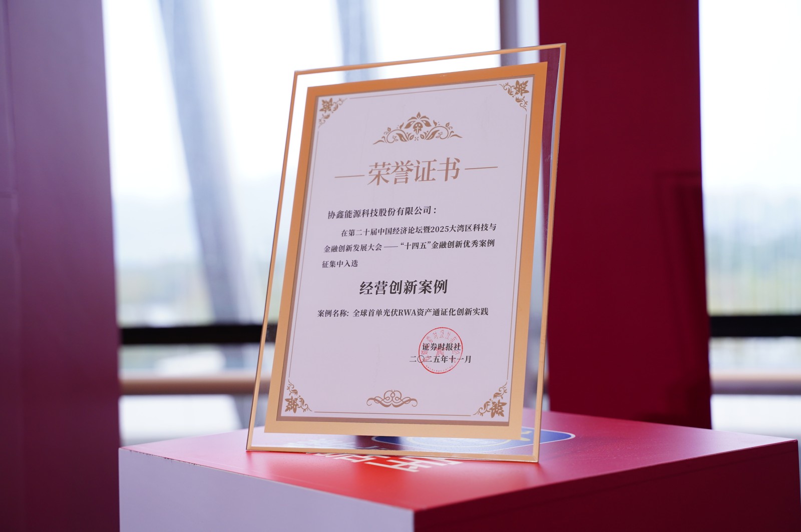 11月18日,第二十屆中國經(jīng)濟(jì)論壇平行論壇——2025大灣區(qū)科技與金融創(chuàng)新發(fā)展大會在廣州南沙落下帷幕。經(jīng)投關(guān)與證券部牽頭申報的“協(xié)鑫能科:破局分布式光伏困境——全球首單光伏資產(chǎn)通證化創(chuàng)新實踐”項目,憑借鮮明的ESG特色、突出的經(jīng)營創(chuàng)新價值及廣泛的行業(yè)示范意義,成功斬獲“十四五”金融創(chuàng)新優(yōu)秀案例(經(jīng)營創(chuàng)新類)獎項,相關(guān)成果獲得大會組委會與行業(yè)嘉賓的高度認(rèn)可。