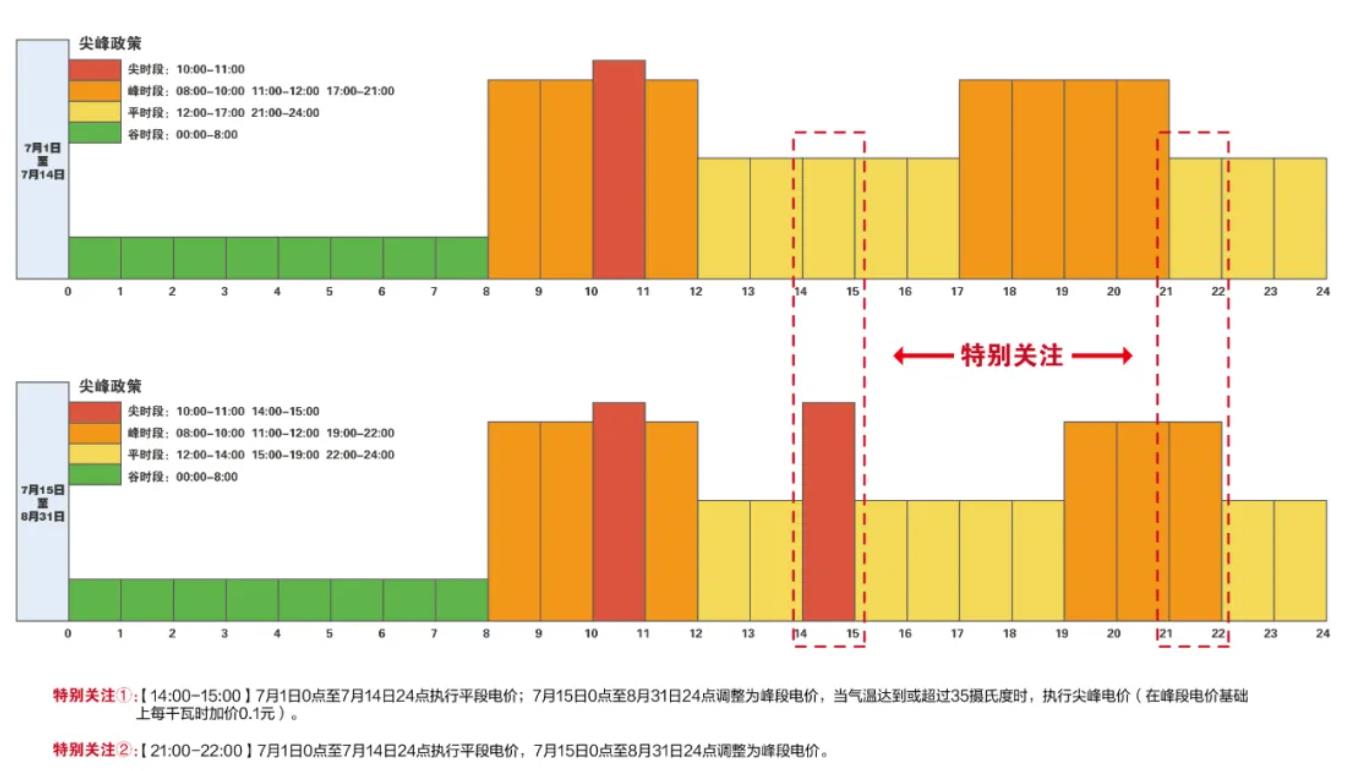 政策明確,針對全省315千伏安及以上工業用電大戶,7月1日至14日,日最高氣溫超過35℃(不含)時,仍按現行尖峰電價政策執行,即:上午10:00-11:00,在峰段電價基礎上每度加價0.1元。