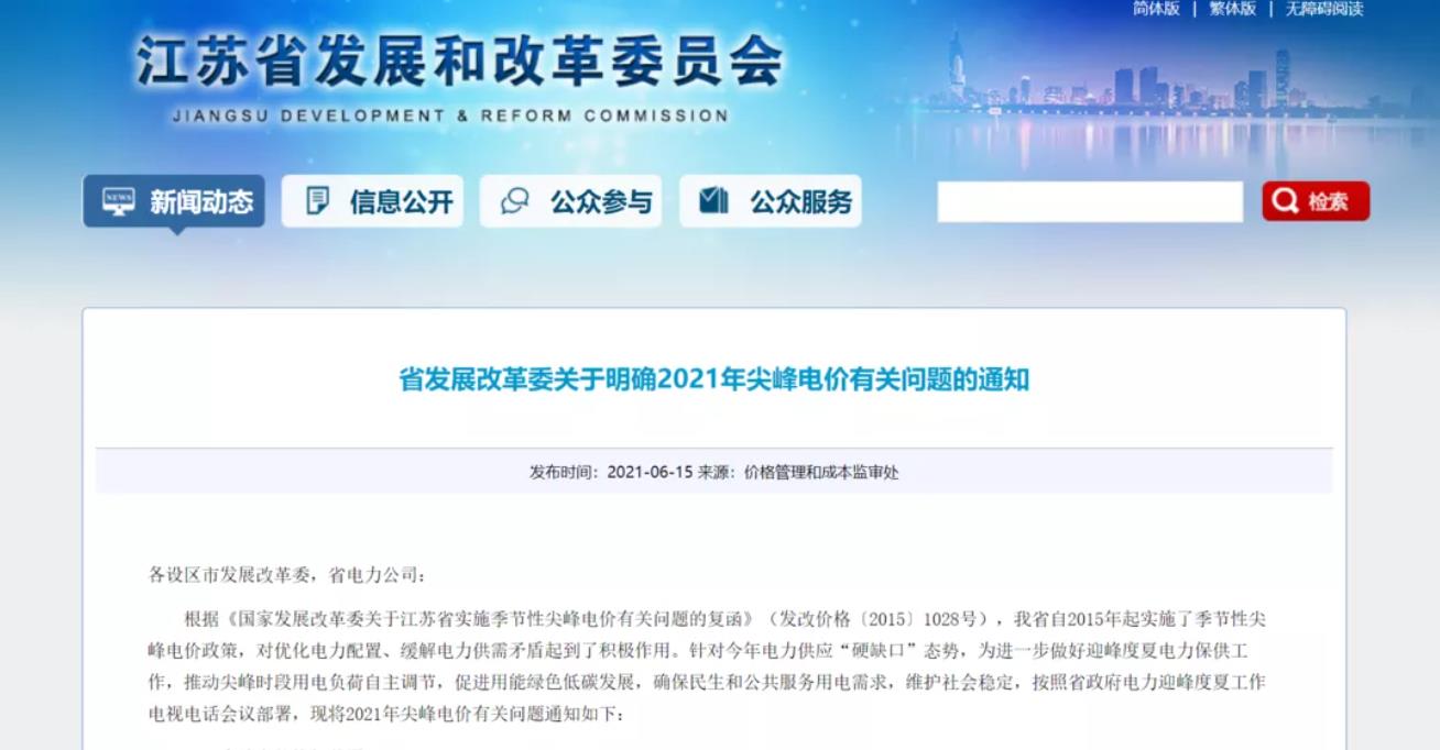 近日,從江蘇省發展和改革委員會獲悉,為引導電力客戶主動參與削峰,江蘇省對315千伏安及以上大工業用戶實施季節性尖峰電價政策。