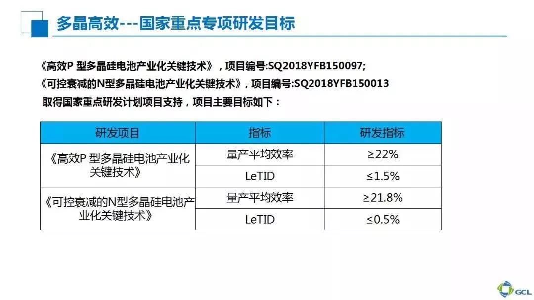 下面展示的是我們目前入選國家重點研發計劃項目的科研專項,分別是由協鑫集成牽頭的高效P型多晶產業化關鍵技術,以及其他一家知名企業牽頭的N型多晶項目。目前兩個項目都已完成公示,即將正式宣布,同時阿特斯也是我們在這兩個項目上重要的合作伙伴。按照研發目標,三年之后,高效多晶電池的平均量產效率將達到22%以上。