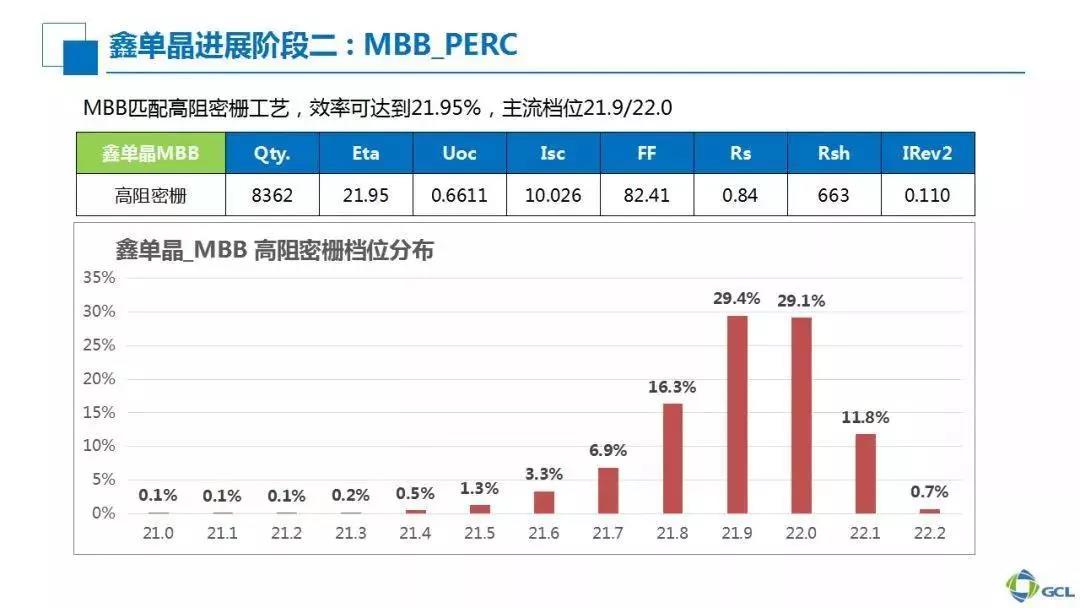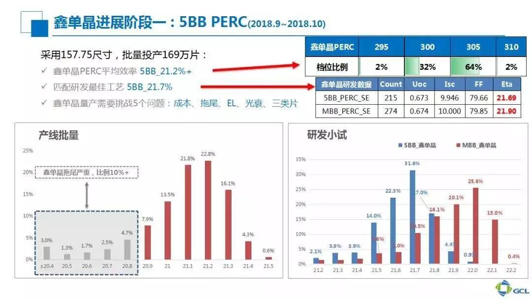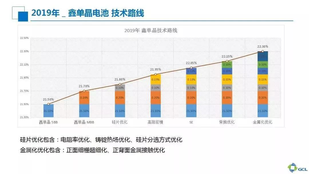 l 2019 多晶PERC量產平均效率21.5%,鑫單晶PERC量產平均效率 22.3%。