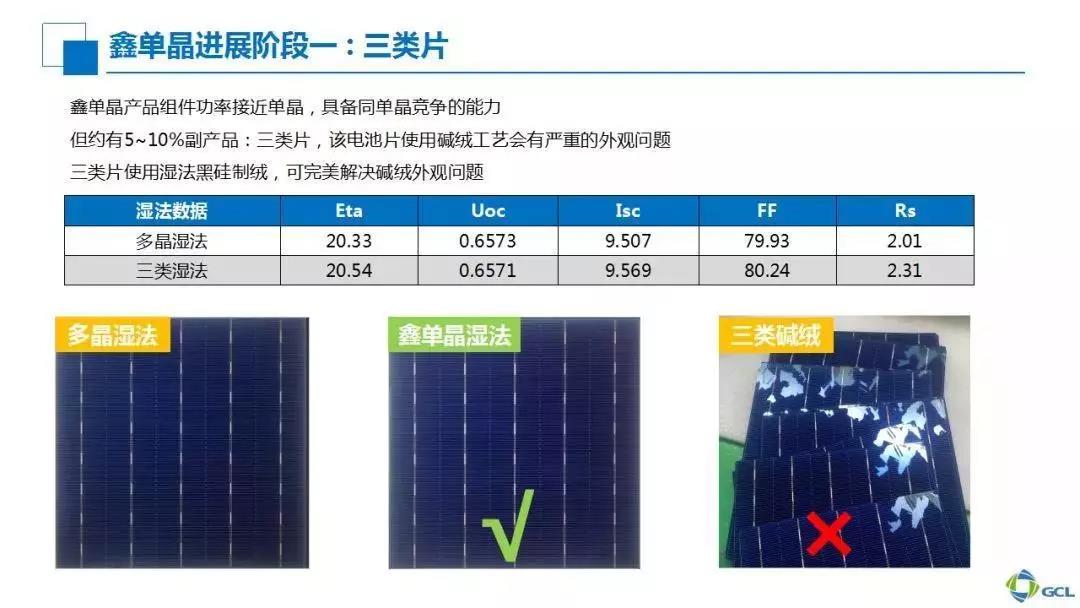 鑫單晶基本采用單晶高效電池的工藝,但三類片采用濕法黑硅工藝可以明顯改善表面的外觀問題。目前三類片的效率在第一階段不到21%,但到了2019年,三類片的平均效率也在21%以上。