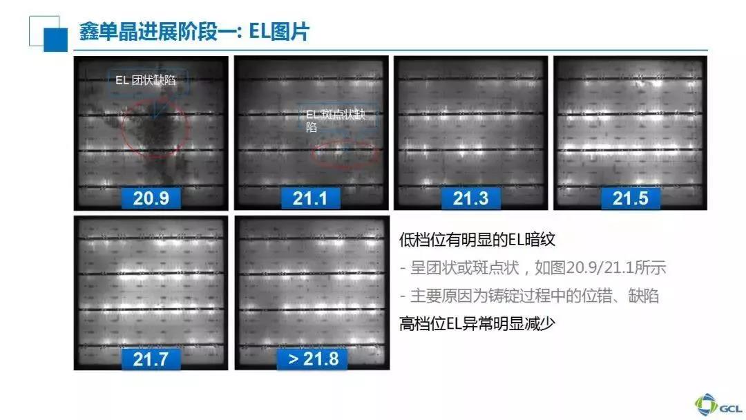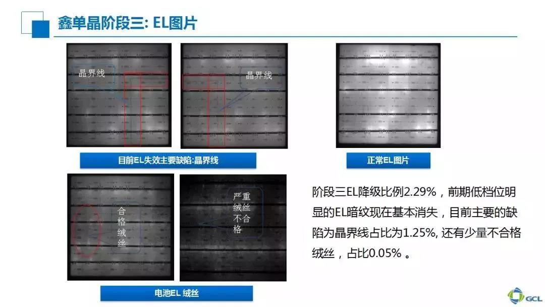 我們再來看EL方面。在第一階段,紅色圓圈部分顯示了一些缺陷造成了效率偏低的情況,但通過第二、第三階段可以看到比較明顯的改善。