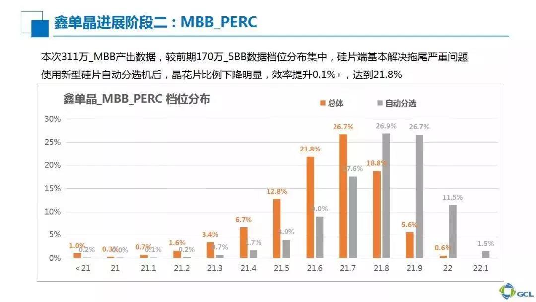 下面再來看自動分選。圖中可以明顯看到灰色主檔位的效率接近21.8%—21.9%這樣的平均效率,主檔位效率往更高效率的右邊偏移。通過硅片質量的改善,平均效率基本上可達到21.9%。