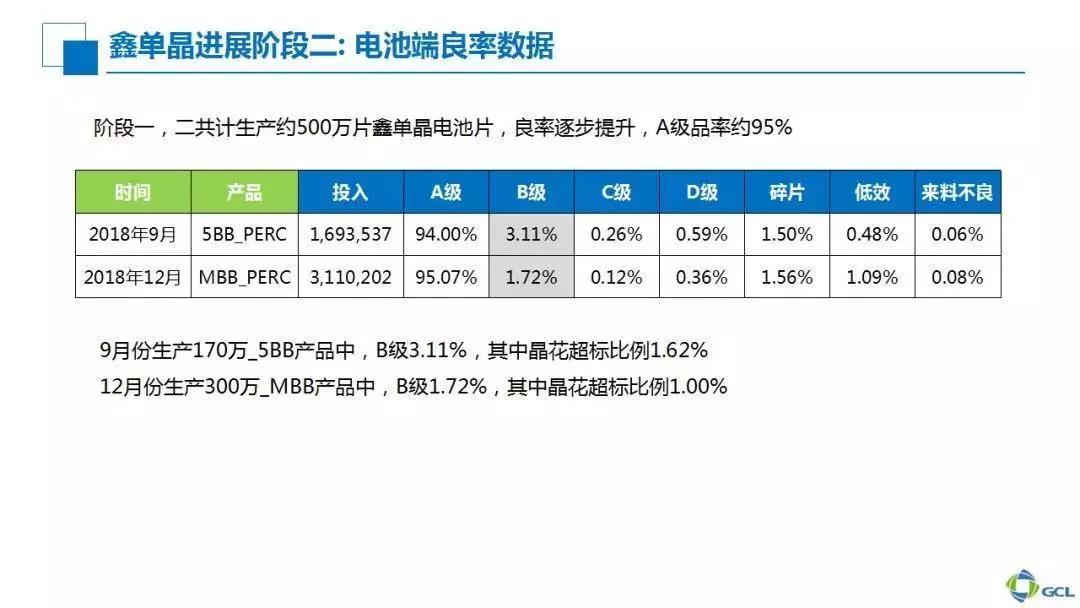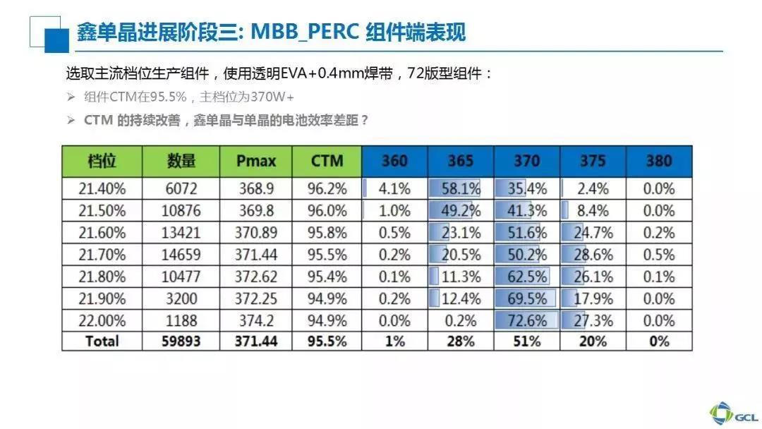 在硅片質量有保證以及電池工藝穩定生產的情況下,可以看到組件主檔位功率在370W以上的占比達70%以上。下一步我們主要繼續提升電池效率和組件CTM,這是我們后期持續改進的一個方向,也同樣說明鑫單晶有很大的潛力,最終與直拉單晶逼平甚至超越。