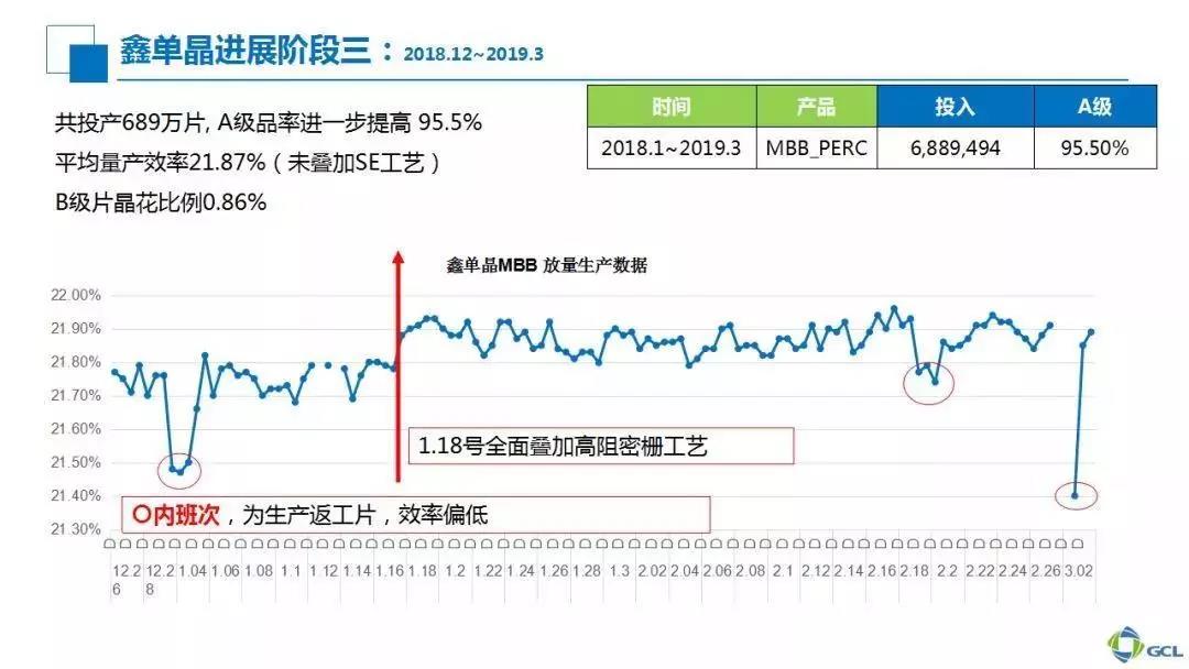 在2019全年計劃中,我們堅信鑫單晶電池平均效率會登上21.8%的關口,這樣就完全可以跟直拉單晶媲美。鑫單晶2019路線圖強調兩方面:一是硅片進一步優化,二是電池工藝持續改善。目前鑫單晶還沒有導入單晶PERC普遍運用的SE工藝,后期若導入SE工藝以及進一步優化,22.2%—22.3%的電池量產平均效率目標是比較容易實現的。