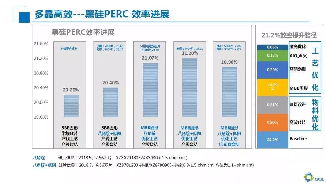 首先,我們從真正的高效多晶講起。目前,在協鑫集成技術工藝同仁的共同努力下,以保利協鑫高效多晶硅片為基礎,協鑫集成多晶黑硅PERC電池的平均量產效率可以達到21%。