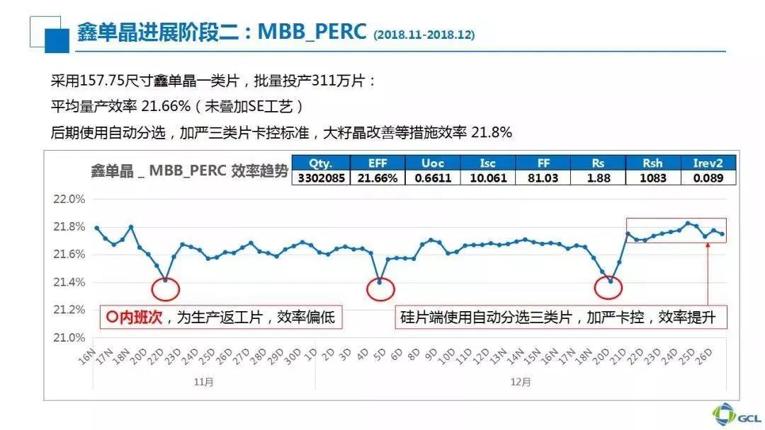 第一階段,我們在硅片端采取了一些主要的改進措施。大家可以看到,第二階段批量投產增加到300萬片以上,同時以多主柵工藝取代第一階段5BB工藝,并且在硅片端通過自動分選等工藝繼續改善,在第二階段后期,平均量產效率可以達到21.8%。我們采取的主要措施發力在硅片端,一個是分選,一個是工藝。
