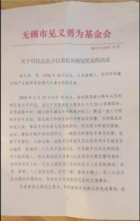 今年2月23日12時許,蘇州協鑫科技產業集團新能源汽車事業部副總裁徐志高駕車從滬宜高速前往宜興環科園。途中發現一輛小轎車出了事故,停在中央護欄旁,路邊一老人不停揮手求救。徐志高立即停車詢問并幫其報警,在得知事故車輛內還有人員被困后,徐志高立即進行營救,并在與路過此處的一輛面包車上人員的合力幫助下,將事故車內2名受傷昏迷人員救出,并及時送往醫院進行搶救。最終受傷人員脫離生命危險。
