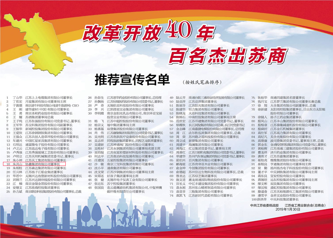 為慶祝改革開(kāi)放 40 周年,中共江蘇省委統(tǒng)戰(zhàn)部、江蘇省工商業(yè)聯(lián)合會(huì)(總商會(huì))決定推薦宣傳協(xié)鑫(集團(tuán))控股有限公司董事長(zhǎng)朱共山等100名為江蘇改革開(kāi)放作出突出貢獻(xiàn)的民營(yíng)企業(yè)家。1月31日,在充分醞釀、反復(fù)比選、集體研究基礎(chǔ)上,推選產(chǎn)生了“改革開(kāi)放 40 年百名杰出蘇商”。、