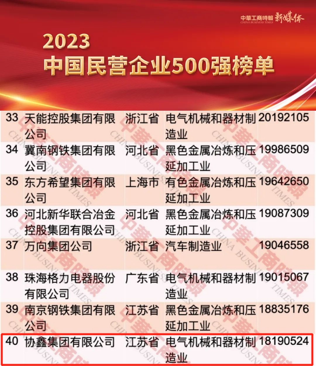 躍升22!協鑫集團上榜2023中國民企500強40位