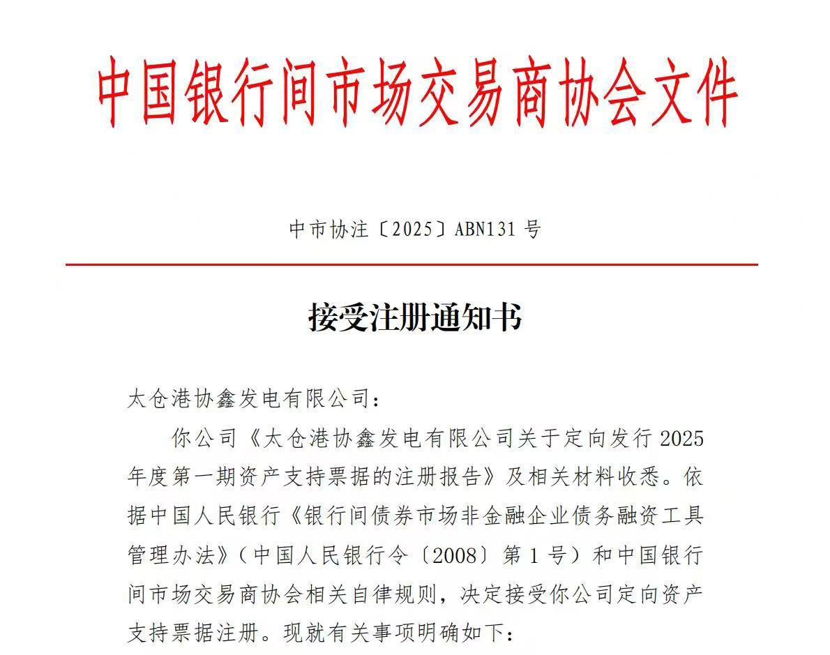 10月29日,協鑫集團旗下太倉港協鑫發電有限公司成功獲得中國銀行間市場交易商協會出具的《接受注冊通知書》,資產支持票據(ABN)注冊金額達45.3億元。這一成果不僅創下今年供電供熱類資產支持票據的最大規模紀錄,更成為民營能源企業在資本市