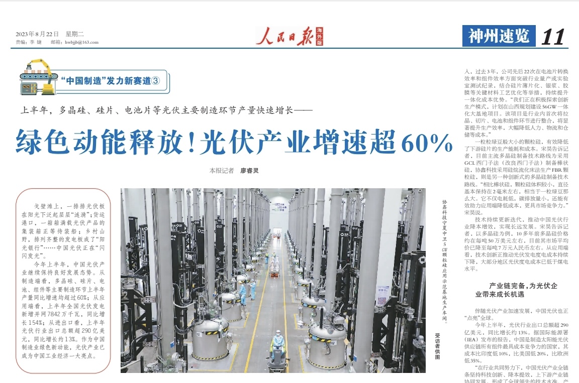 下游應(yīng)用市場需求旺,上游制造端更是一派火熱。 在協(xié)鑫科技寧夏中衛(wèi)5GW(吉瓦)顆粒硅應(yīng)用示范基地生產(chǎn)車間,一輛輛自動導(dǎo)引運輸車來回穿梭。從加料到取棒,該項目已實現(xiàn)全流程數(shù)字化和自動化操作。 “顆粒硅是一種顆粒