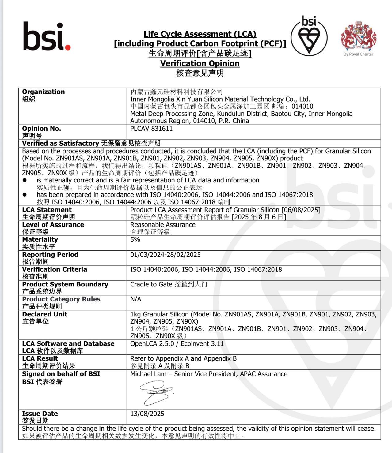 近日,協鑫科技旗下內蒙古鑫元硅材料科技有限公司(包頭基地)獲得國際權威認證機構英國標準協會(BSI)頒發的生命周期評價核查意見聲明,公司顆粒硅產品“搖籃到大門”碳足跡僅為14.2756kgCO?e/kg,顯著低于行業平均水平,創造了硅基材料低碳生產的新紀錄。